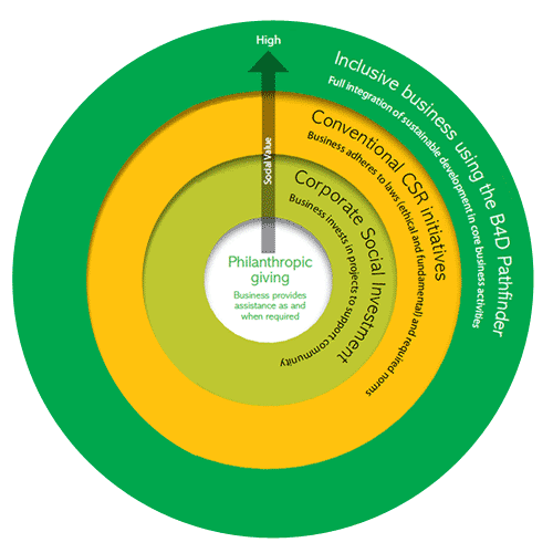 Inclusive business is an evolution and the gold standard of CSR; it allows business to leverage financial value and development gain simultaneously. Where appropriate, other CSR activities - partnership, Corporate Social Investment (CSI), ad-hoc giving and philanthropy - remain vital to a company's overall interaction with society.