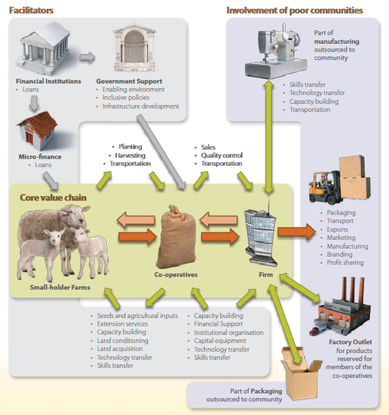 Companies can build bridges with low income communities, and contribute to overcoming poverty by including them in the value chain. This may be as suppliers and consumers of products and services, as well as potential distributors, retailers, employees (including shareholders, owners and partners in joint ventures) or sources of innovation. This puts the relationship between company and community on a more equitable and mutually beneficial footing, so that they survive and grow together. It enables the community to participate productively in the local economy, and safeguards human dignity through the principles and practices of CSR.